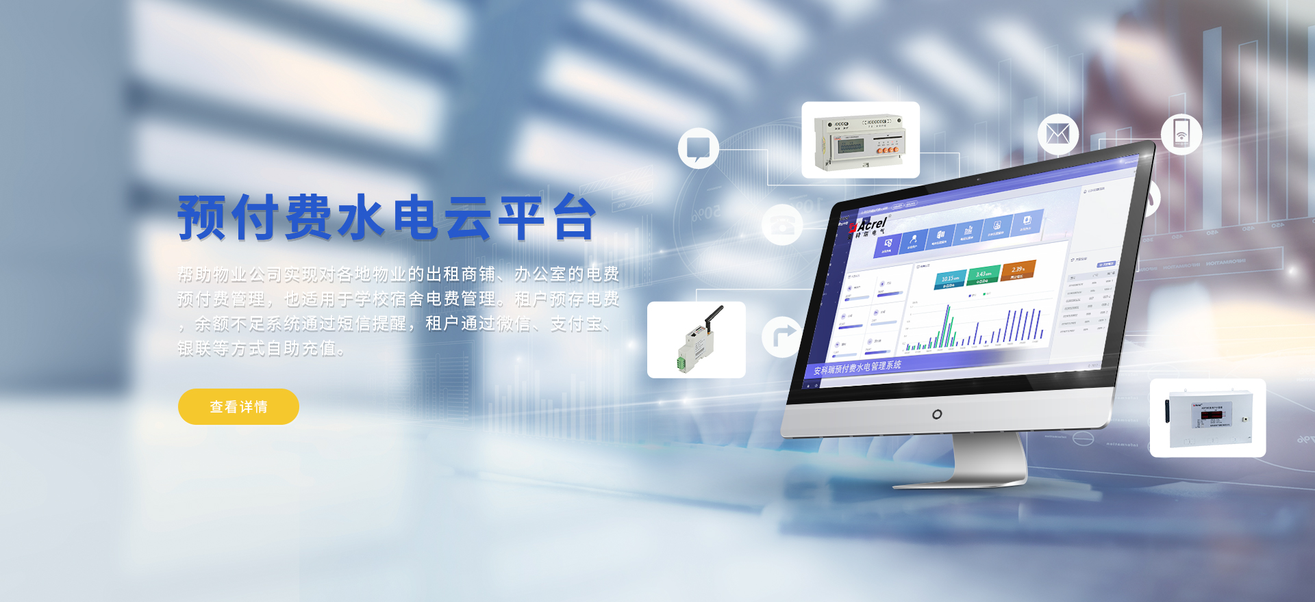 安科瑞提供的解決方案包括Acrel-EIoT能源物聯網云平臺變電所運維云平臺、安全用電管理云平臺、環保用電監管云平臺、智慧消防云平臺能源管理云平臺、工業企業能源管控平臺、遠程預付費云平臺、餐飲油煙監管云平臺、電動汽車/電瓶車充電樁收費管理云平臺、電力監控/無線測溫系統、電能質量治理系統、電氣火災監控系統、消防設備電源監控系統防火門監控系統、應急照明和疏散指示系統、智能照明控制系統、醫用隔離電源絕緣監測系統等,幫助用戶實現能源智能化、可視化、精細化管理,提高用能效率和用能安全,為企業節能降耗和實現能源數字化建設提供數據服務。